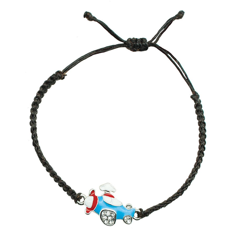 This braided bracelet comes with a enameled airplane in the middle. Assorted color airplanes