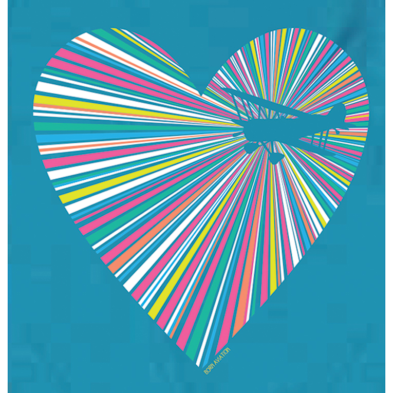Large Heart with a silhouette of a biplane in the middle. Multi colors printed on a Turquoise youth shirt. XS-LG