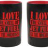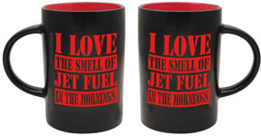 “I love the smell of Jet fuel in the mornings” Printed in red ink on a black mat finish with red interior. 14 oz.