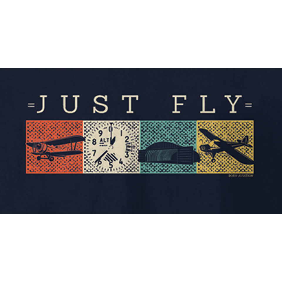 Just Fly printed over top 4 cubes with aviation images inside of them. 100% preshrunk cotton. Navy M-XXL