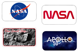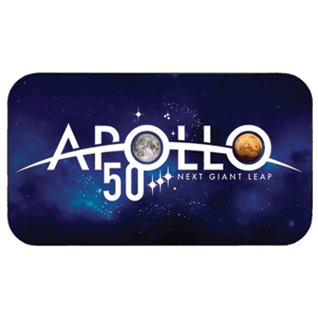 12 Tins of Sugar Free Peppermints in a display of 4 assorted images of NASA and Apollo 50th Logo. Tin is 2 3/4 x 1 1/2 x 3/4 in. .56 OZ.