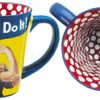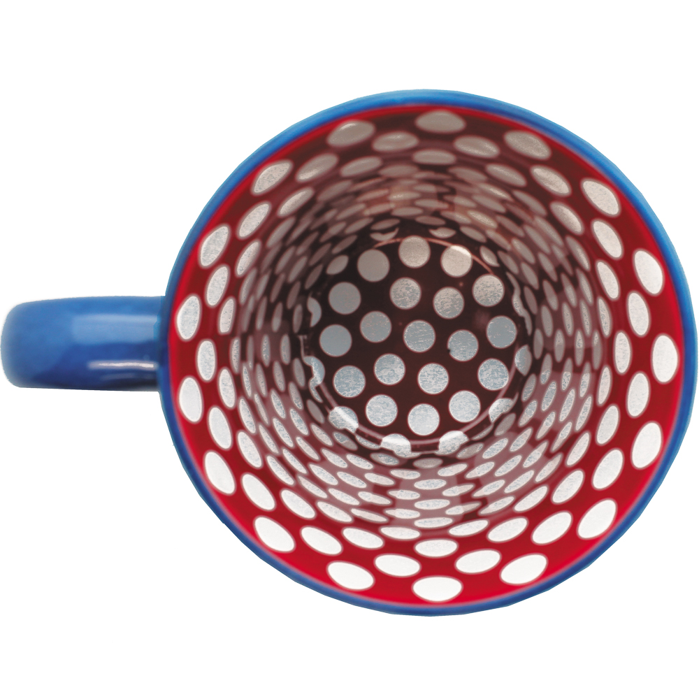 This 11 oz. Mug is colored on every surface inside and out. Rosie image on both sides with a yellow background and blue handle. A bright red and white Polka Dot pattern on the inside.