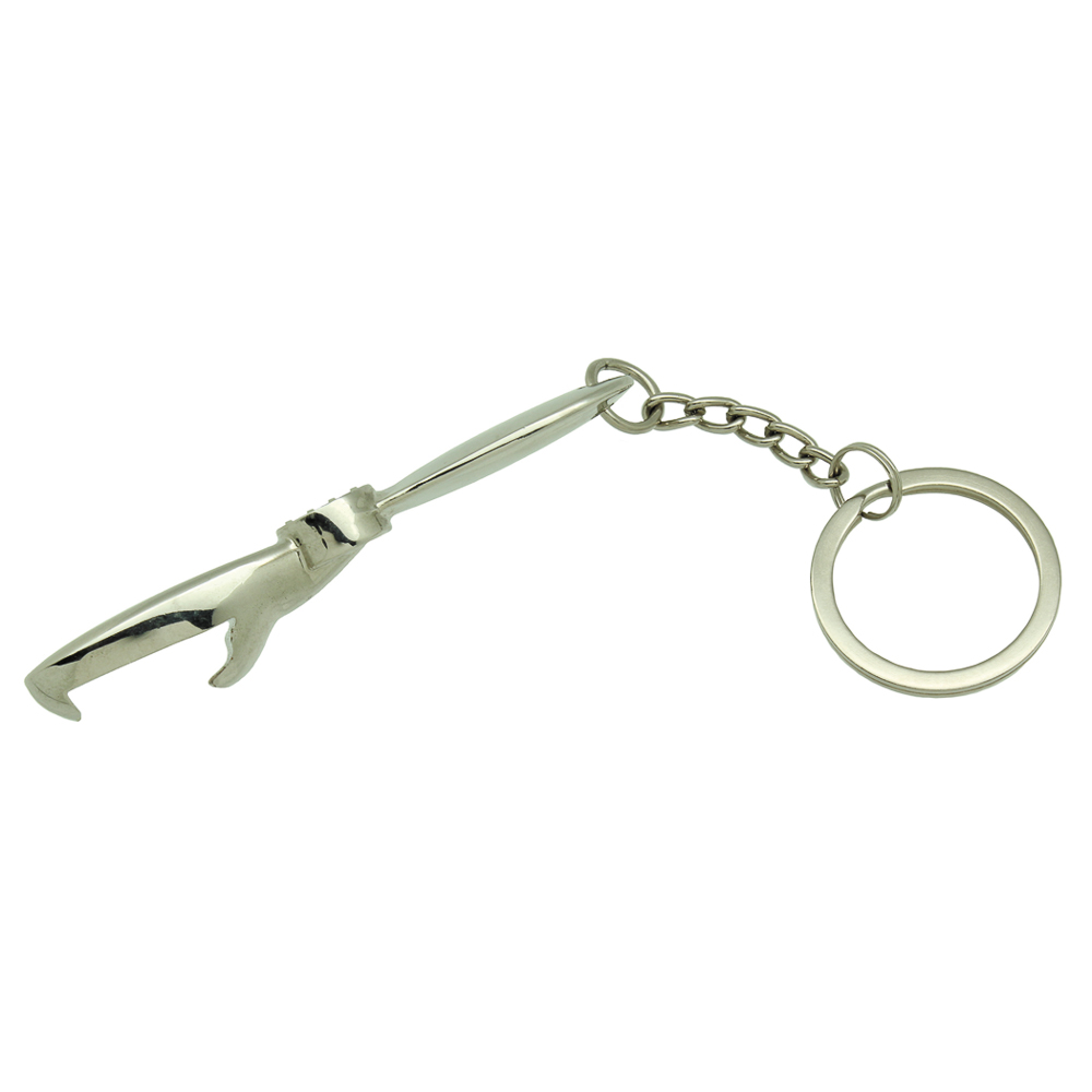 Key Chain shaped like a Propeller with a bottle opener on the bottom side. Chrome plated metal. 3 inches.