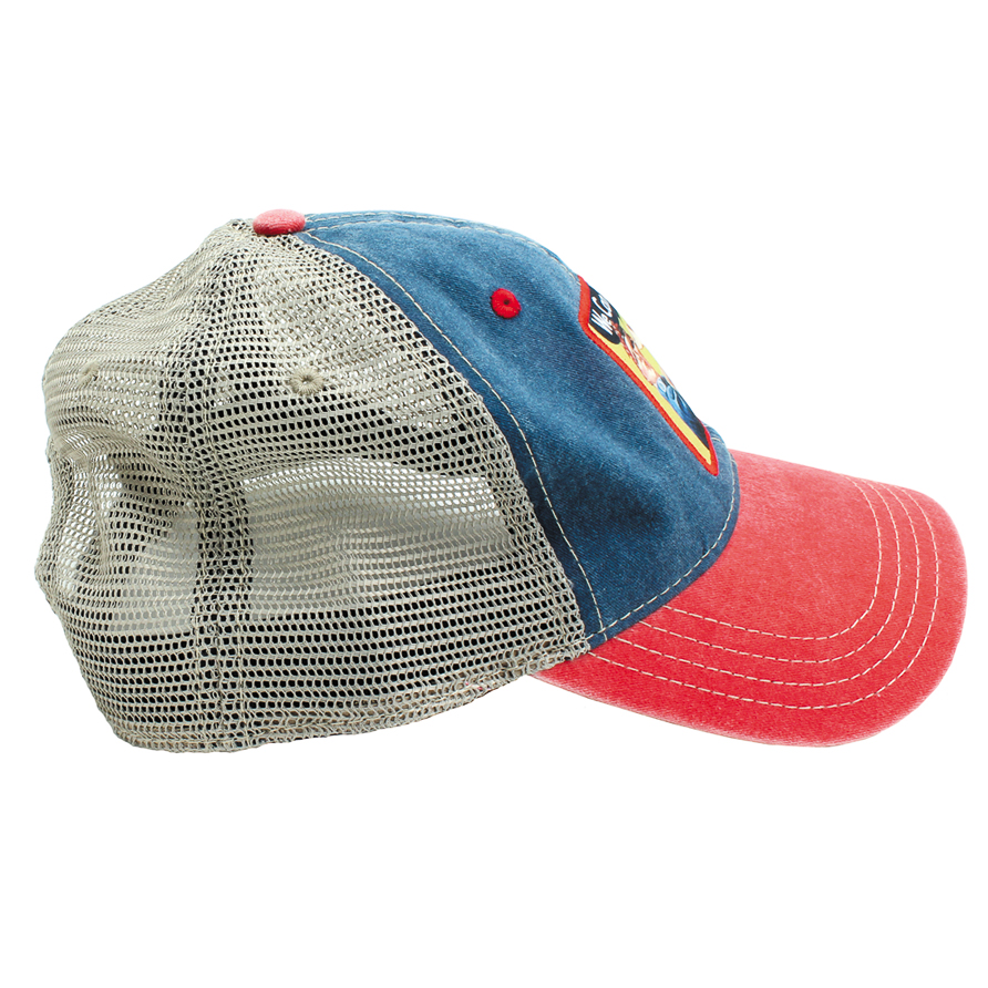 A Rosie the Riveter Patch on a mesh, snap back on a faded blue and Red Hat.