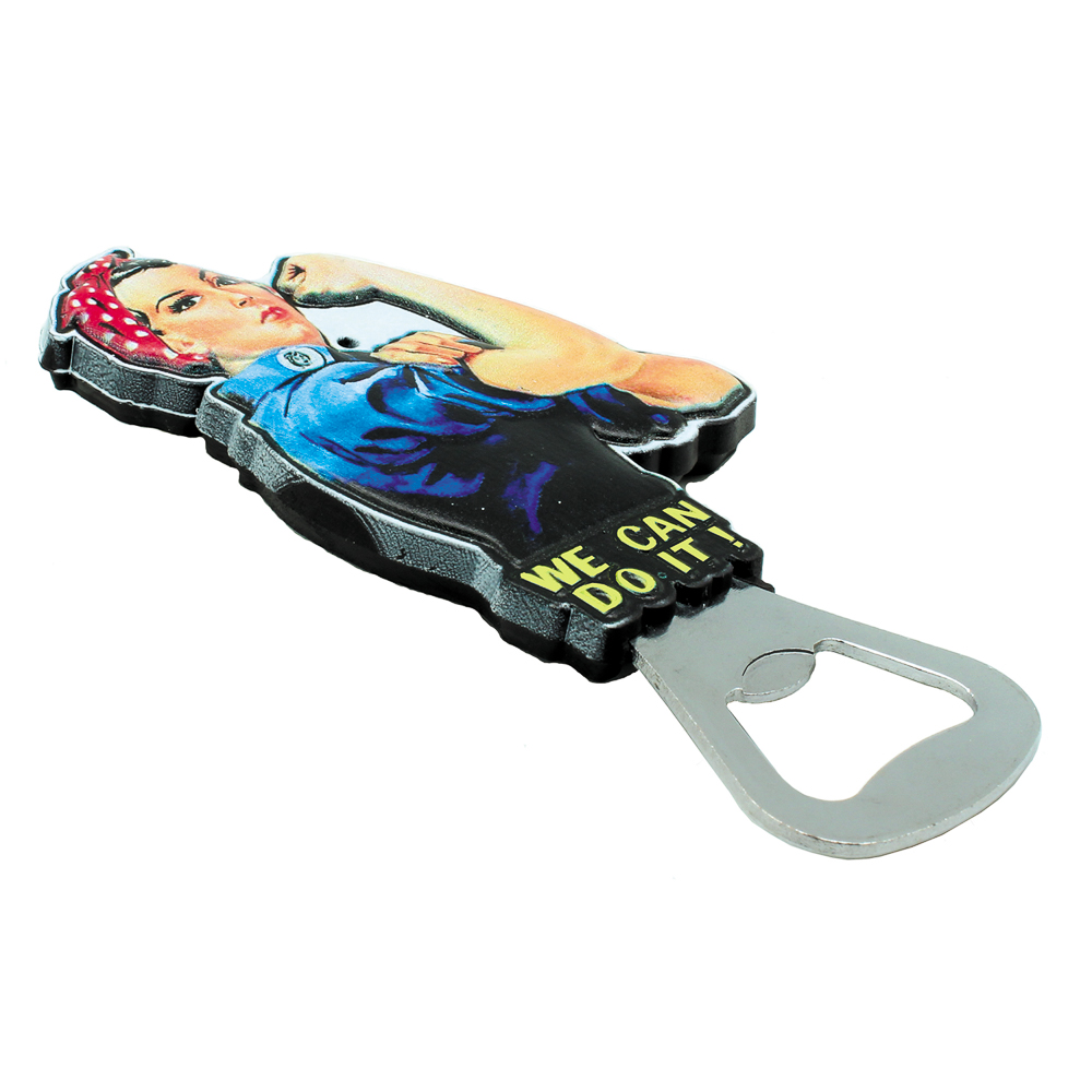 This 3D relief bottle opener has the image of Rosie with a bottle opener. Also the bottle opener is Magnetic.