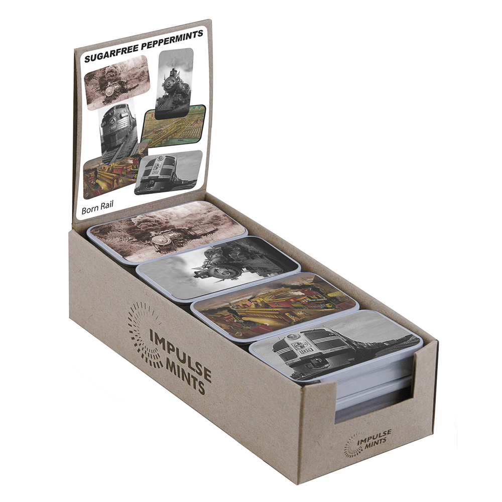 12 Tins of Sugar Free Peppermints in a display with Rosie The Riveter image. Tin is 2 3/4 x 1 1/2 x 3/4 in. .56 OZ.